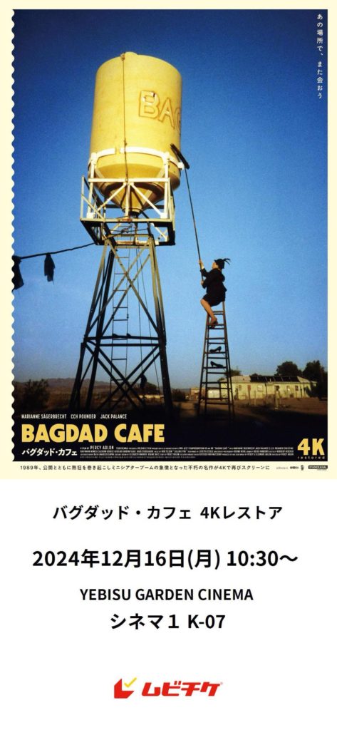 改めて観て、この映画の魅力ってなんだろう?とか考えるわけだけど、それは荒涼としたルート66に佇む、寂れた「バグダッド・カフェ」そのものにあり、ヤスミンをはじめ、出演者たちの笑顔にあり、その空と大地のコントラストにあるんだなと気がついた。その意味では、4Kレストアにて、その映像美はさらに増したんじゃないかな。