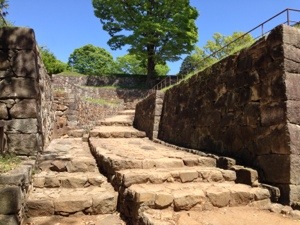 ガイダンス施設の裏手にハイキングコースの入口があり、ここから金山城址まで上がっていける。のだが、いやね、まあ、ハイキングコースだけあってそこそこな登山です。20分くらいの距離で大したことないけれど、普段運動不足な私はややバテ。