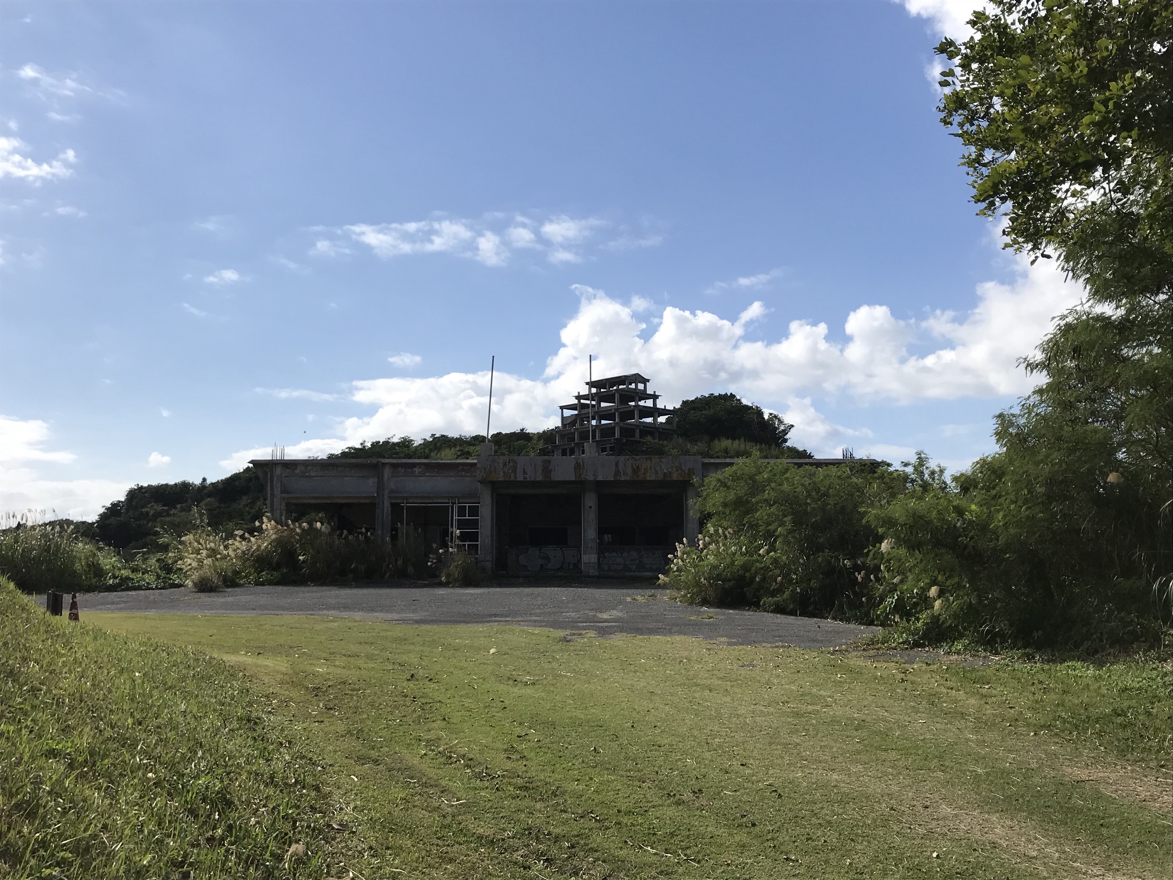 まず中城城の正門にたどり着く前に目につくのは、廃墟マニア界では有名な廃墟、「中城高原ホテル」。私有地につき立ち入ることはできないが、遠景としてその威容を眺めることができる。城ではないが、同じ廃墟という意味では城みたいなもの。